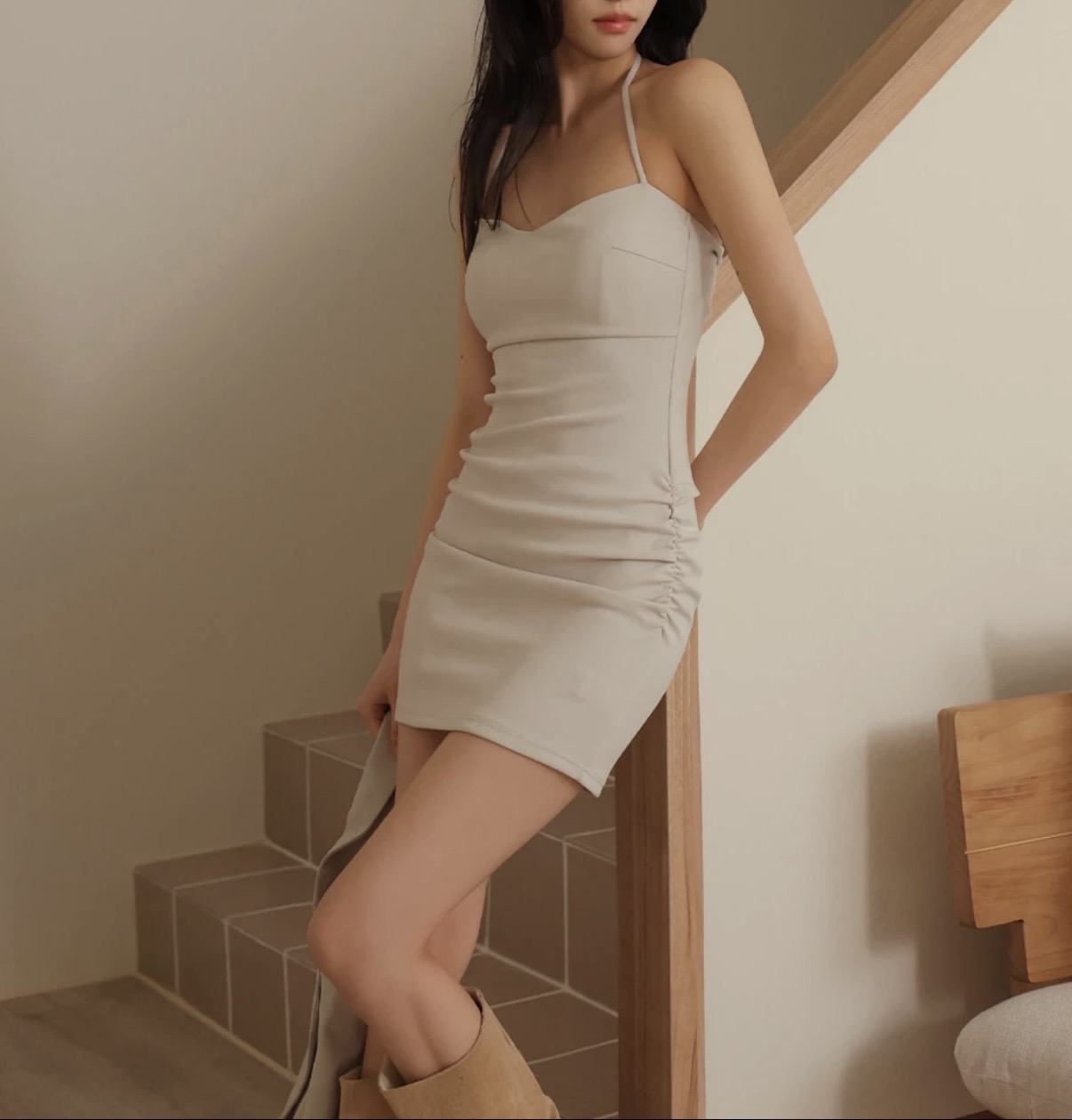 The exclusive "Cloud Mamba Cotton" is a cotton-blend fabric that is fluffy, resistant to wrinkles, and offers cloud-like softness with structured support. This short dress features a sweetheart neckline and unique bust-line tailoring to enhance the chest shape. The halter straps elongate the neckline, and the subtly exposed back adds a touch of allure. Side ruching at the waist shapes a curvy, flattering silhouette.