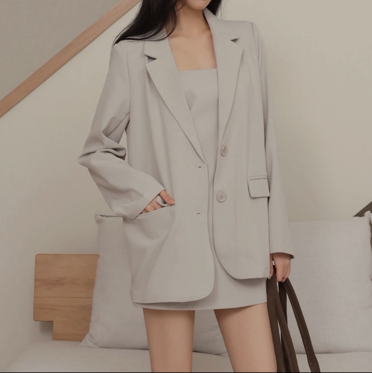 The loose, long-line cut makes this blazer feel less formal and adds a fashion-forward touch. The slightly structured yet drapey suiting fabric maintains shape without appearing bulky, even with shoulder pads. This is a versatile, high-quality blazer suitable for both professional and casual settings.