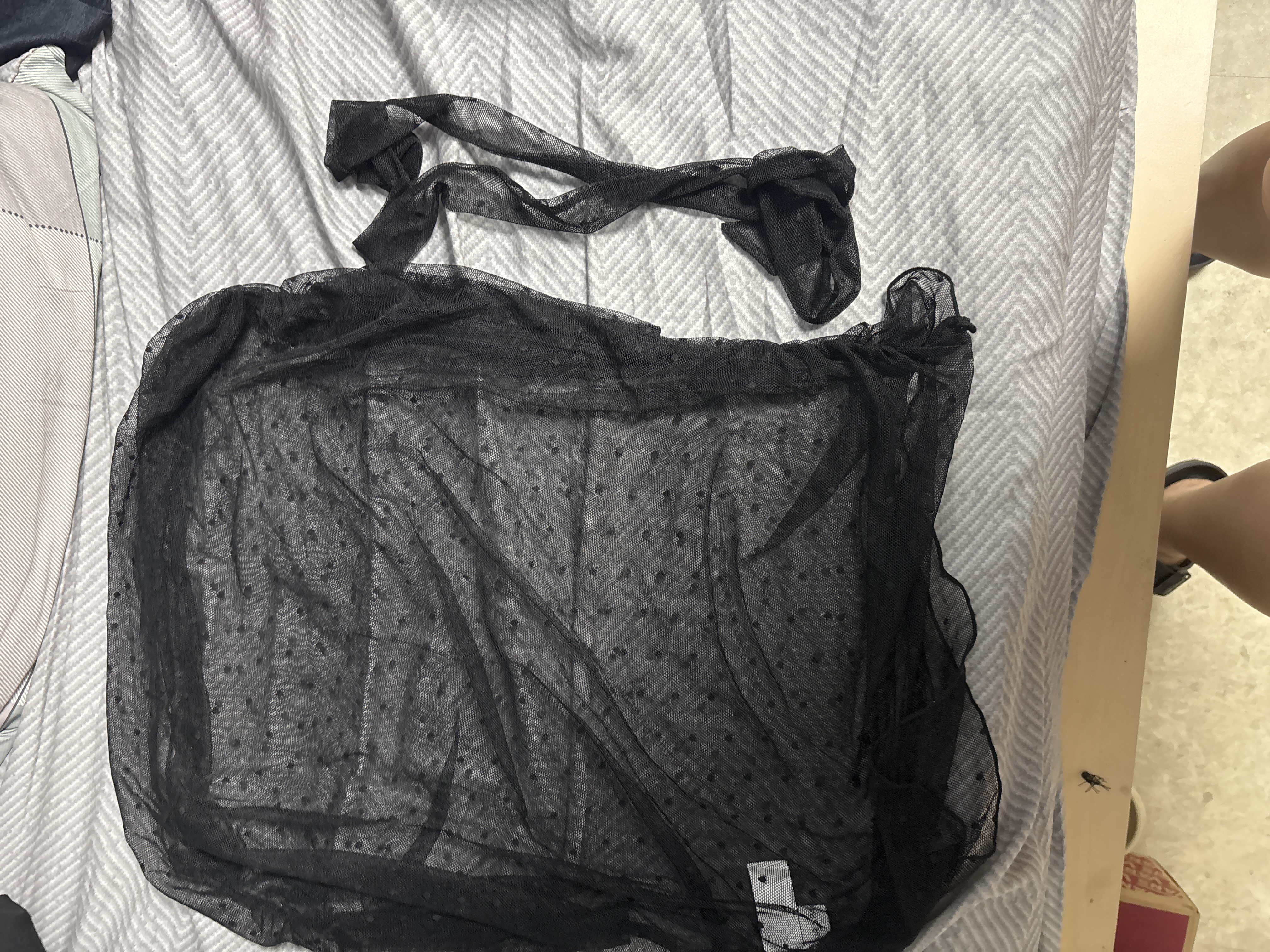 The polka dot mesh layered with a spaghetti strap cami creates a sexy, dimensional look. The ruched mesh design combined with a straight neckline can be worn off-shoulder or as a straight neckline, and the matching fabric neck scarf adds more styling versatility. The built-in bra padding of the cami can be used or removed as needed. Paired with a mini skirt, it creates the perfect subtly bold and romantic style.