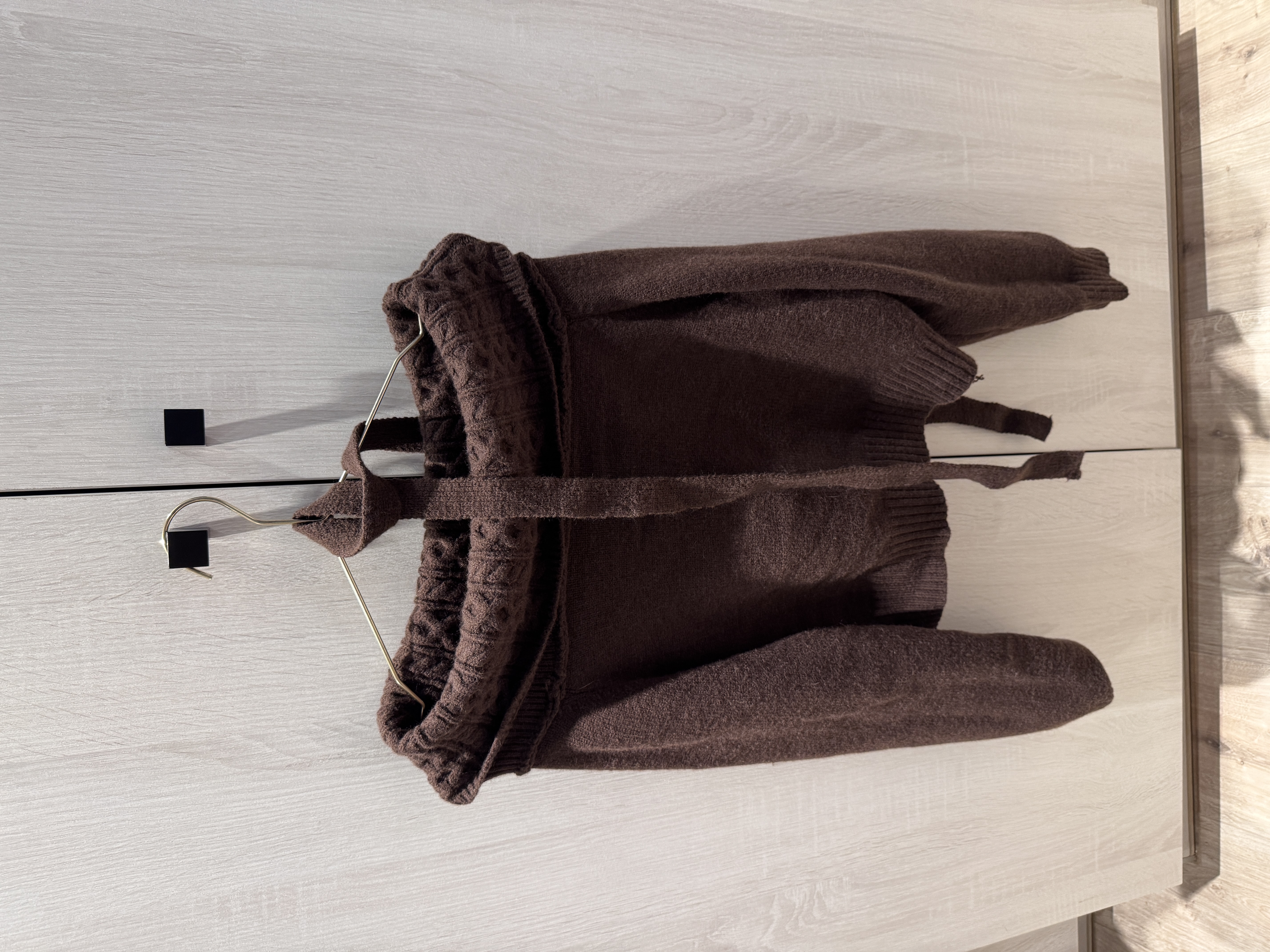 Reka bentuk leher lurus dengan kemasan lipatan rajut menonjolkan garis bahu secara semula jadi, dipadankan dengan skarf rajut halus yang menambah sentuhan bergaya. Potongan pendek membantu memanjangkan proporsi bahagian bawah badan serta memberi kesan visual yang ringan, menjadikannya item rajut yang unik dan mudah dipadankan.