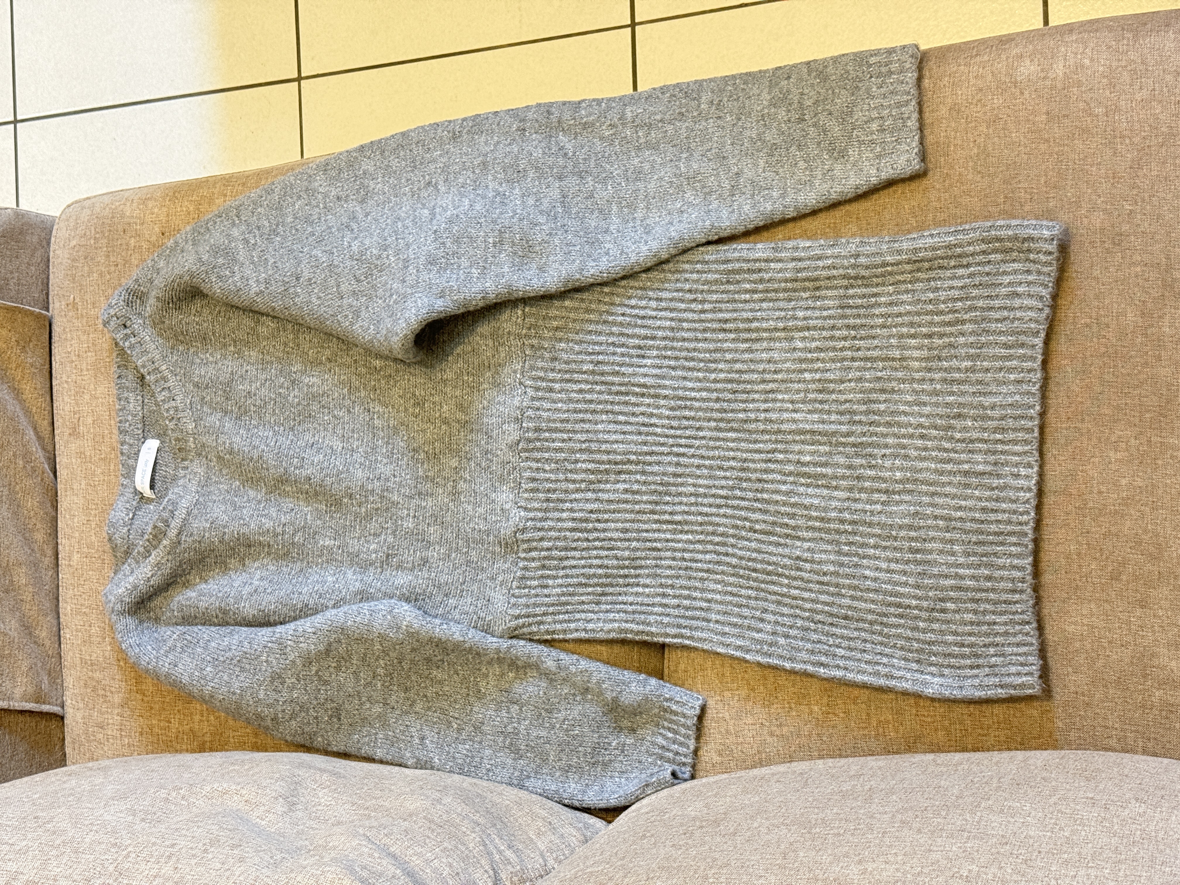Rekaan leher tidak simetri dipadankan dengan tali halus, menampakkan satu sisi bahu untuk mencipta fokus visual yang menarik. Potongan lengan bersambung dan siluet fit badan membantu membentuk lengkungan dengan kemas tanpa rasa ketat, menjadikan helaian ini mudah digayakan untuk penampilan musim sejuk yang kemas dan bergaya.