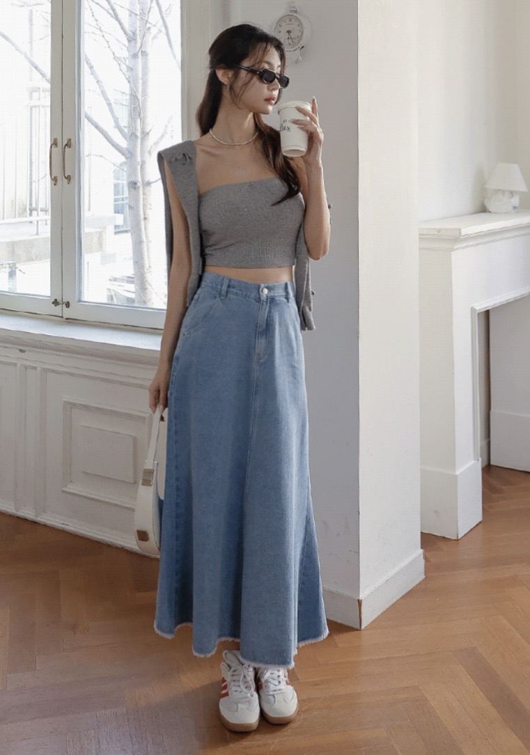 軟單寧系列的裙子、褲子都很好穿,這件長裙長度比較短,小個子女生穿很剛好!