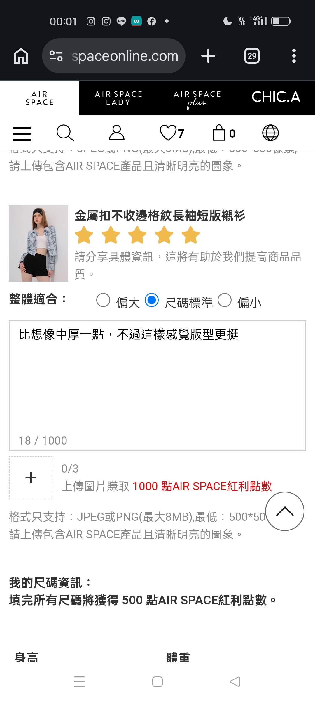 | 版型 | 貼身 | 1 | 2 | 3 | 4 | 5 | 寬鬆 |