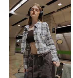 金屬扣不收邊格紋長袖短版襯衫