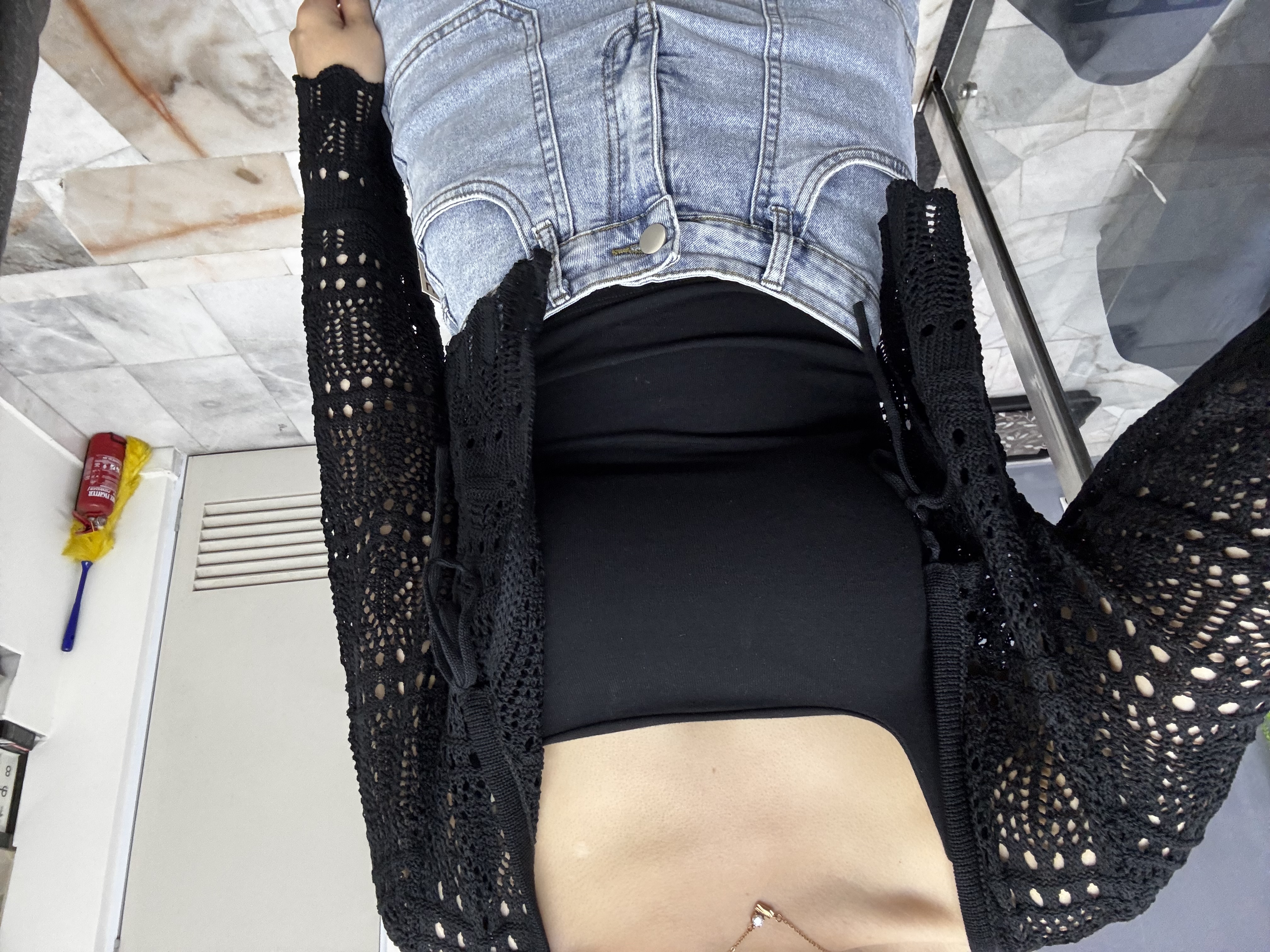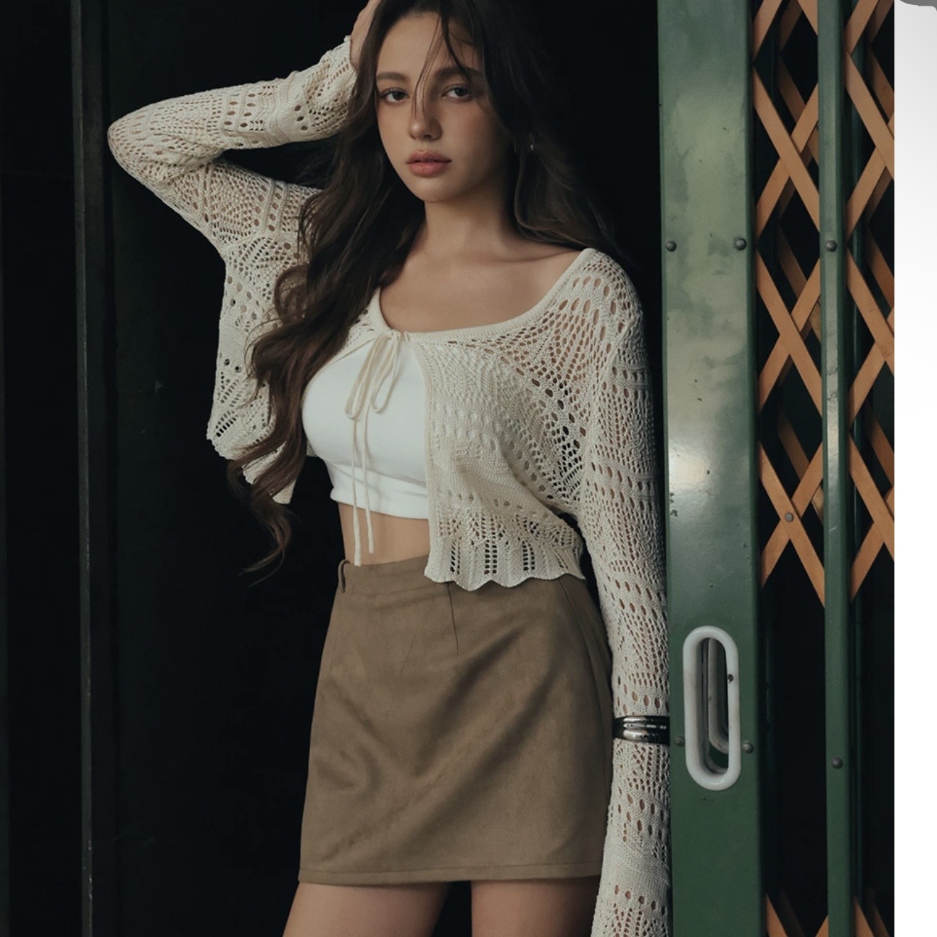 非常好看!!!有點針織厚度,手臂不是纖細款的人可以要考慮一下(因為我自己個人覺得手臂偏勒) 長度很短~建議裡面直接穿bra top!