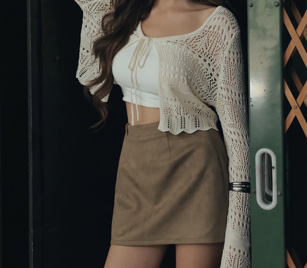鏤空綁帶花邊下擺長袖短版開襟針織衫