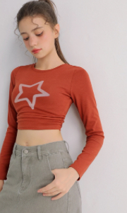 星星印花圓領側抓皺長袖短版上衣