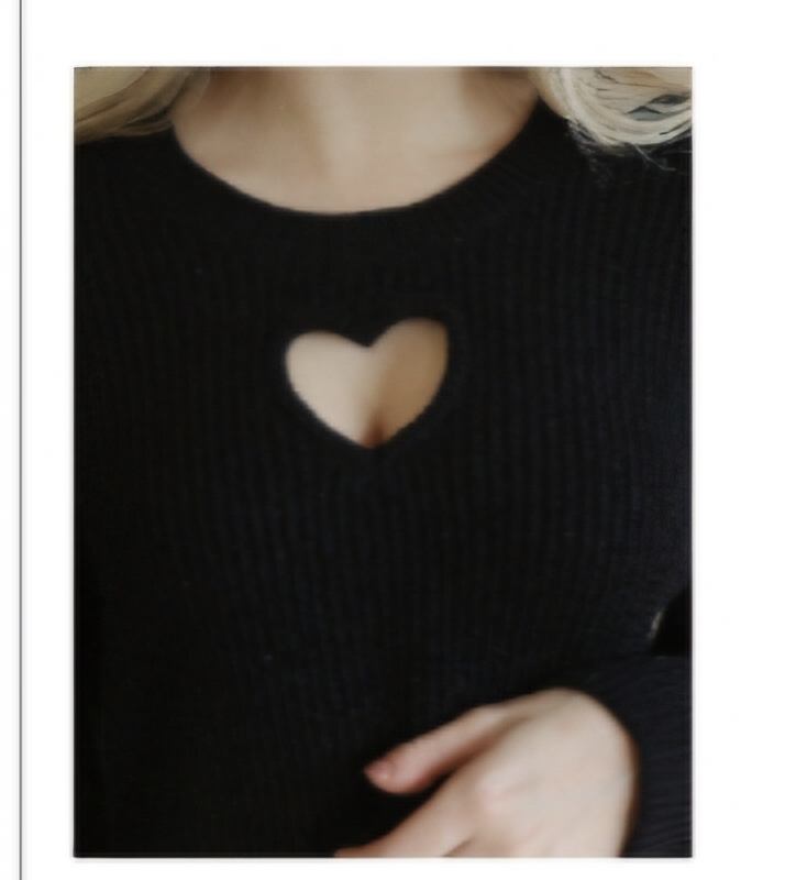 愛心鏤空設計圓領長袖短版羅紋針織衫