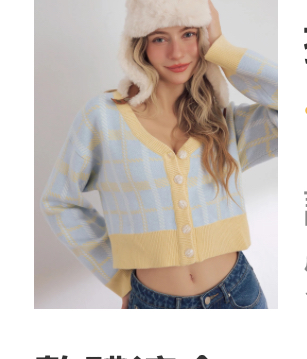 格紋搭配撞色滾邊,可愛有活力。V 領設計可拉長頸部線條,視覺上小臉、顯瘦。短版剪裁營造修長比例。針織材質輕盈溫暖,讓日常穿搭不厚重。