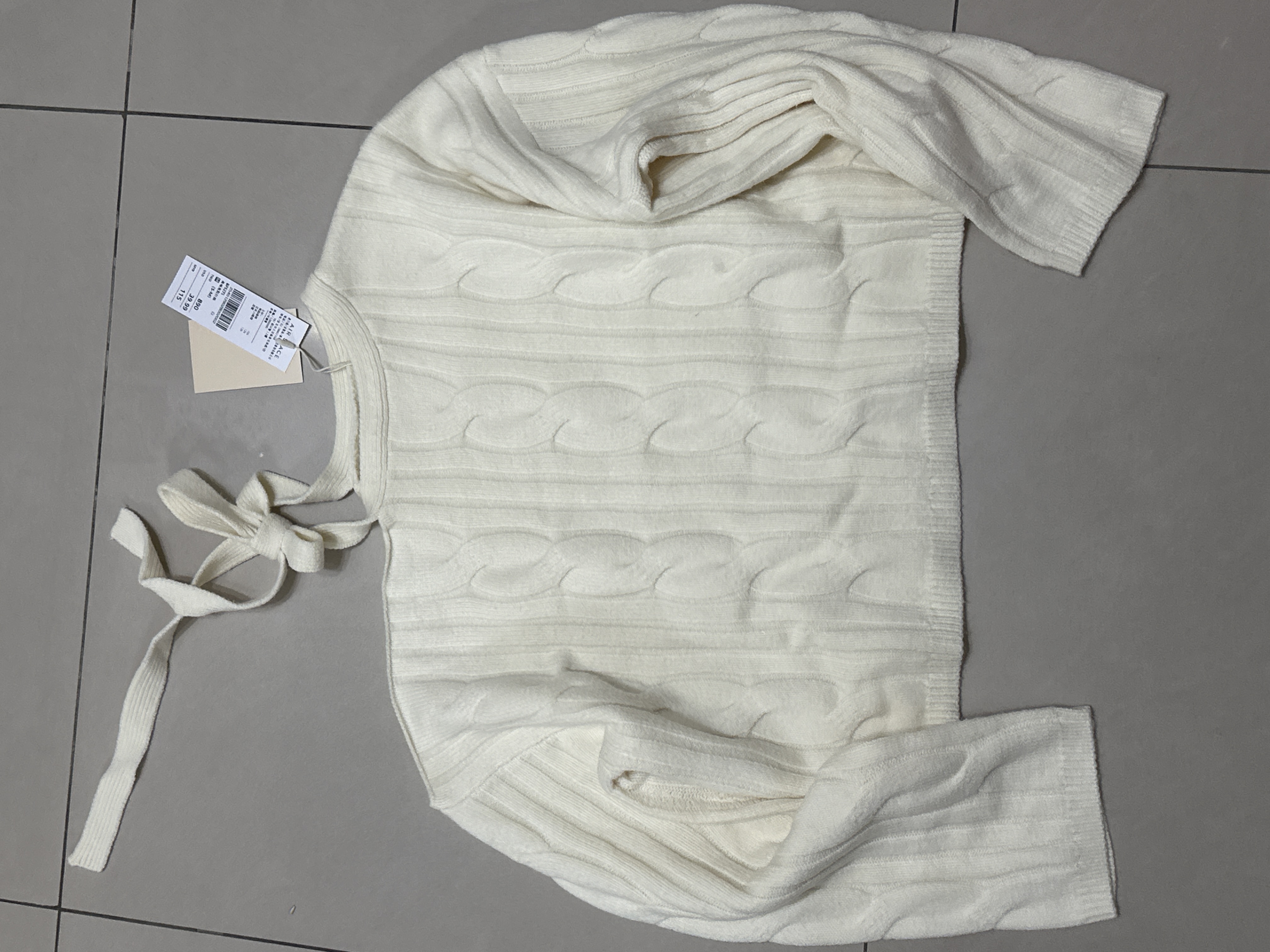 不對稱領口搭配單肩綁帶形成視覺重點,微露的肩線讓上身更顯柔美。麻花紋理增加立體感,短版剪裁拉高腰線比例。是一款讓日常穿搭呈現溫柔可愛氣息的單品。