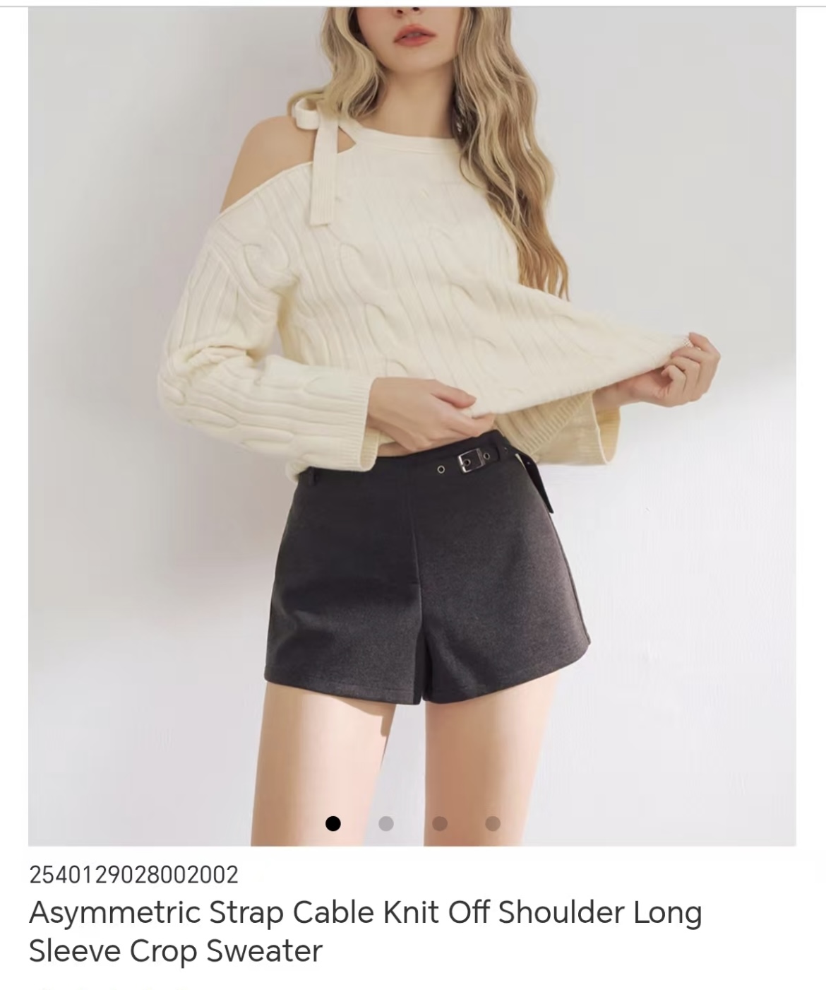 不對稱領單肩綁帶麻花紋長袖短版毛衣