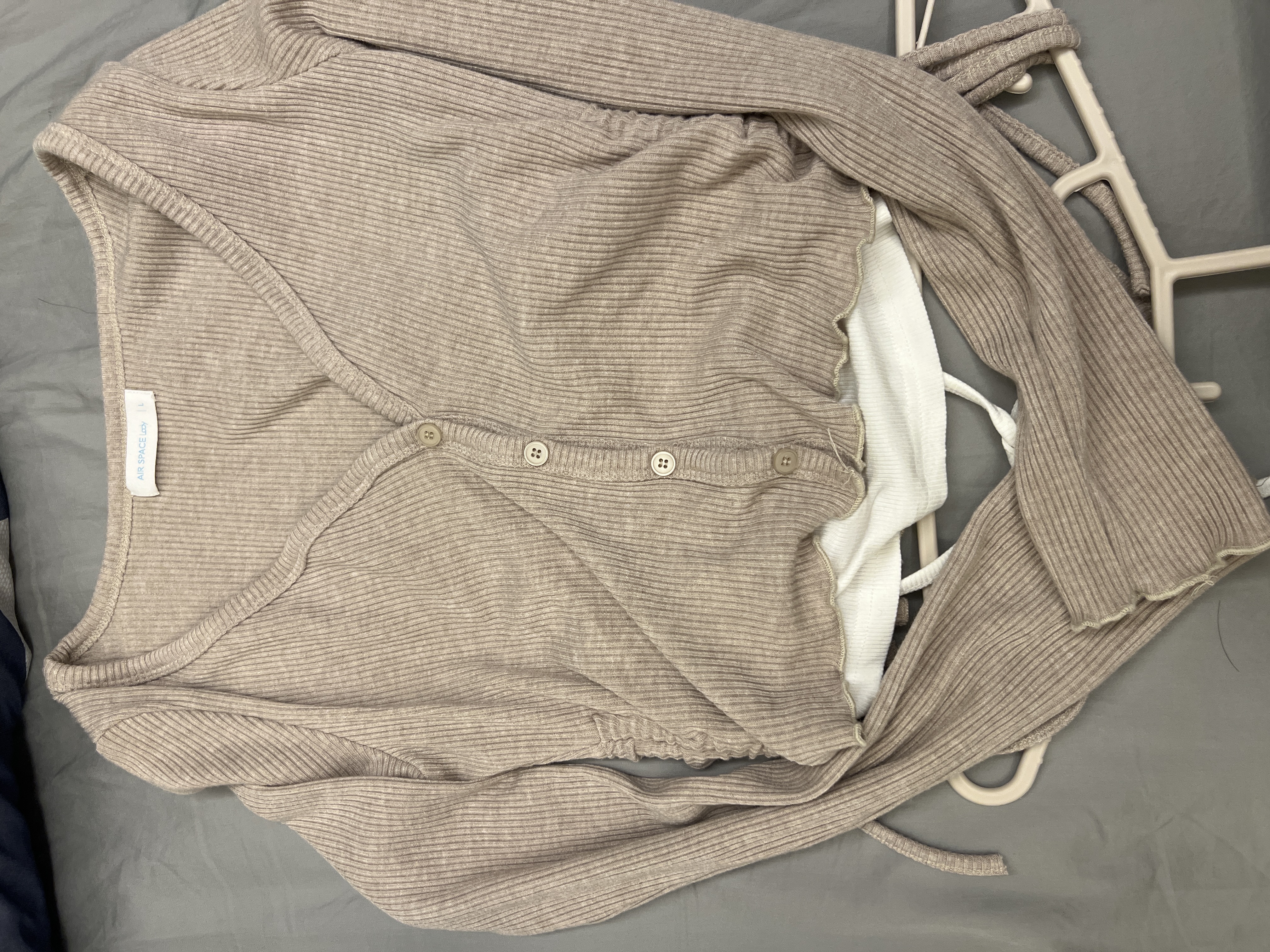 假兩件V領繞頸綁帶側抽繩長袖木耳邊羅紋開襟衫