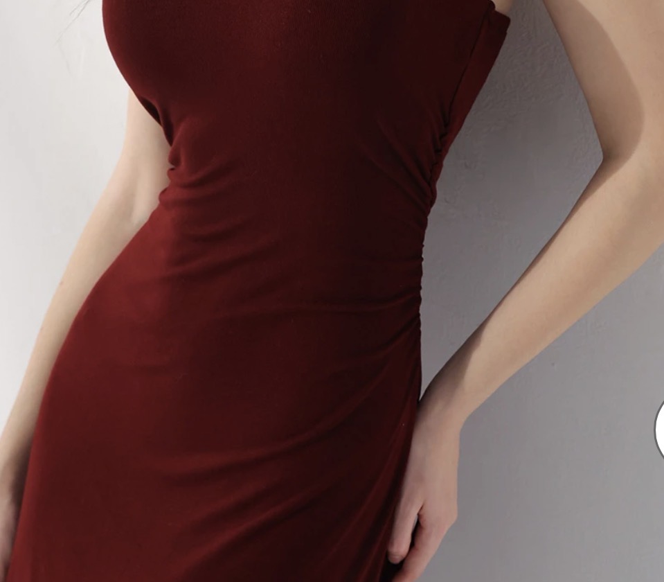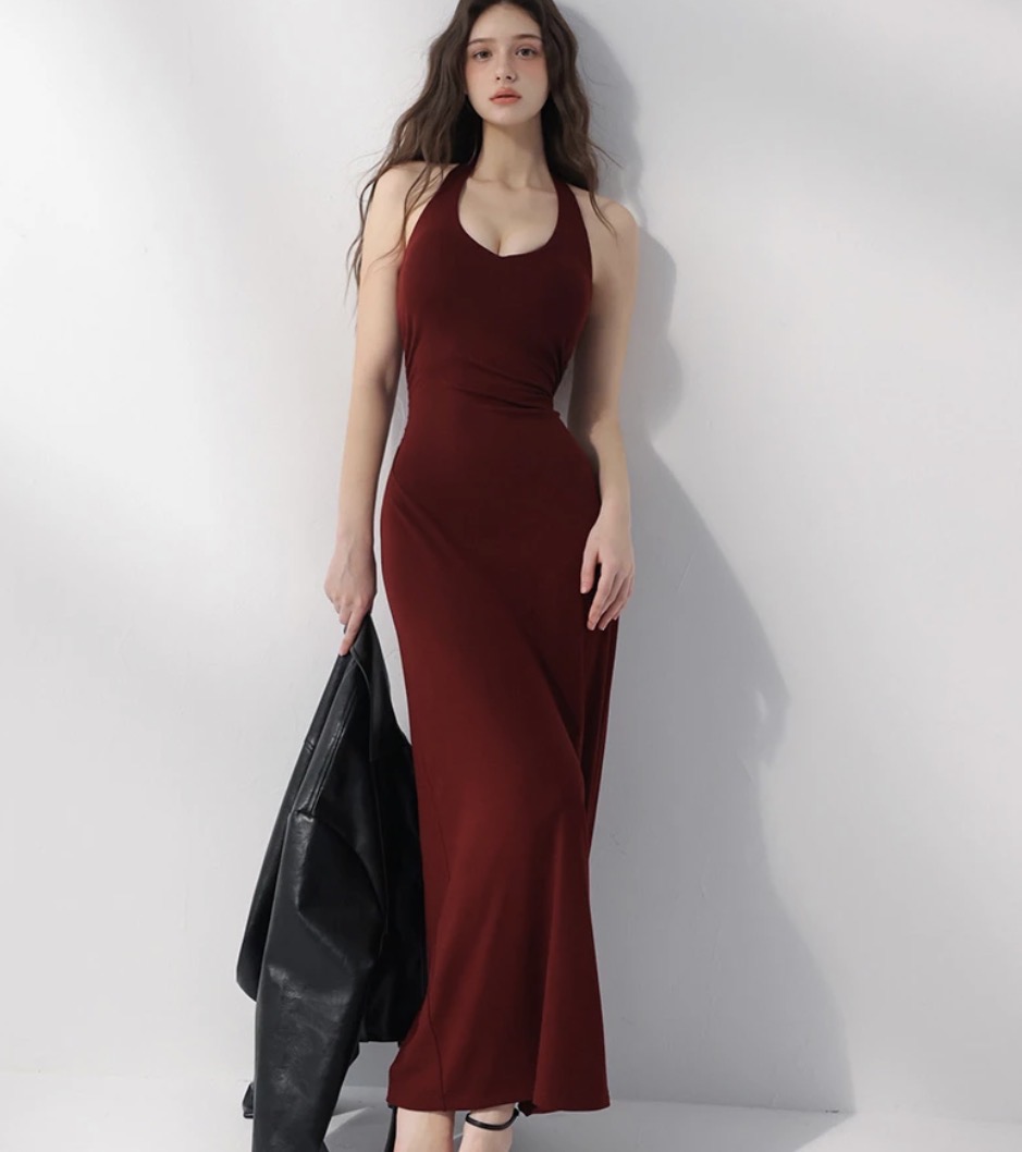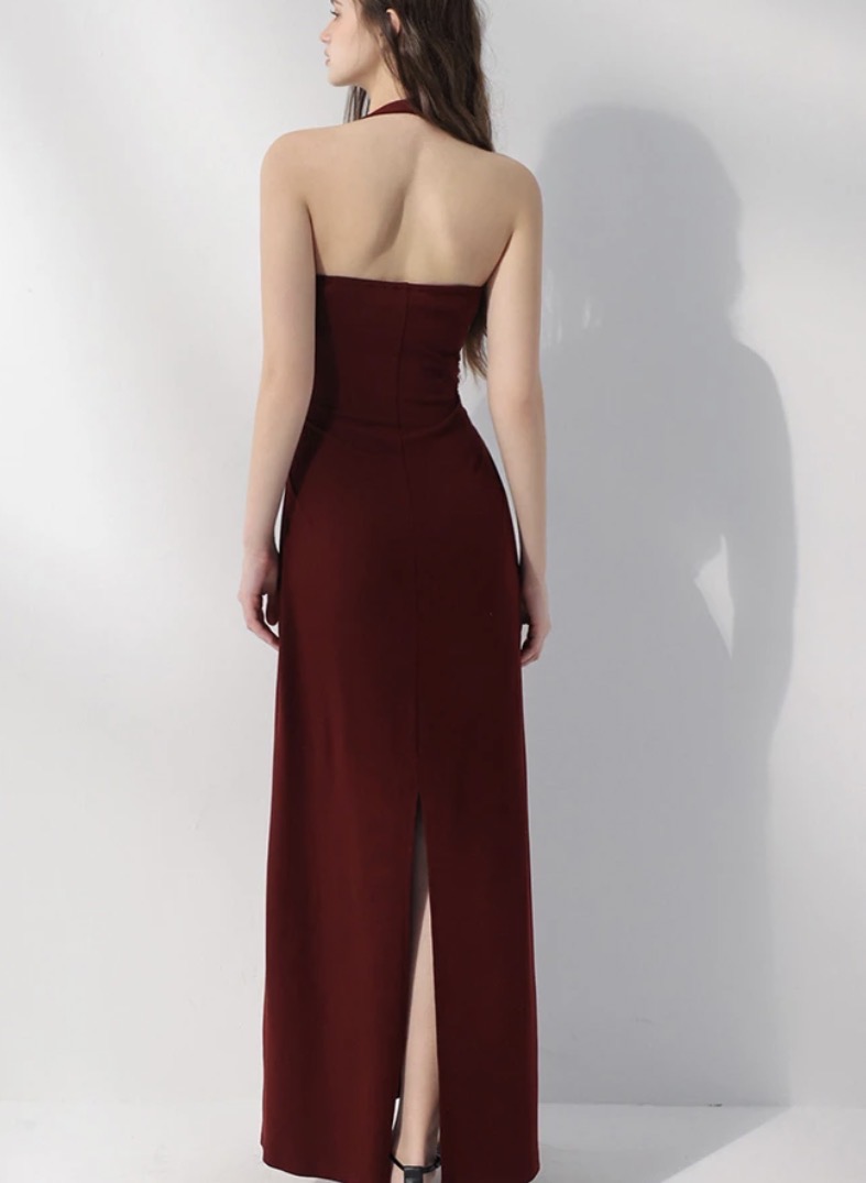 V領繞頸與露背設計,能盡情展現迷人的肩背線條。腰側抓皺自然收緊身型,加上後開衩裙擺,行走時流露出一種內斂的性感,是約會或正式場合的首選女神級洋裝。