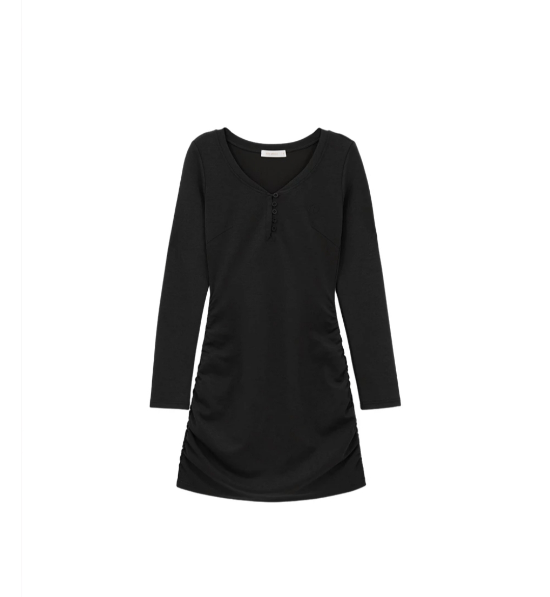 親膚的莫代爾砂洗棉面料結合合身短版型,讓舒適與顯瘦同時達成。裙身側邊抓皺設計,能順著身形展現迷人的S曲線。圓領加上排扣半開襟,可隨心調整領口深度,為穿搭增添一點性感魅力。