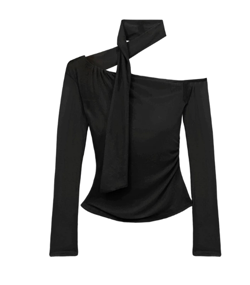 不對稱領繞頸領巾單肩挖空長袖合身上衣(附胸墊)