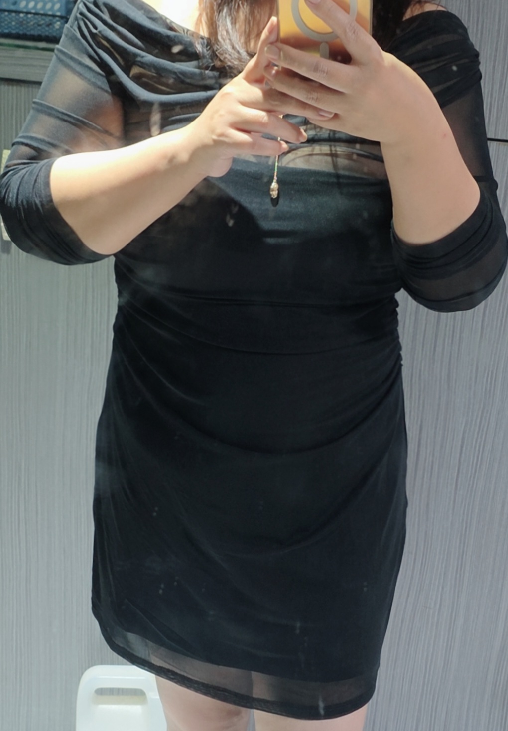 2WAY 一字領長袖側抓皺網紗BRA短洋裝