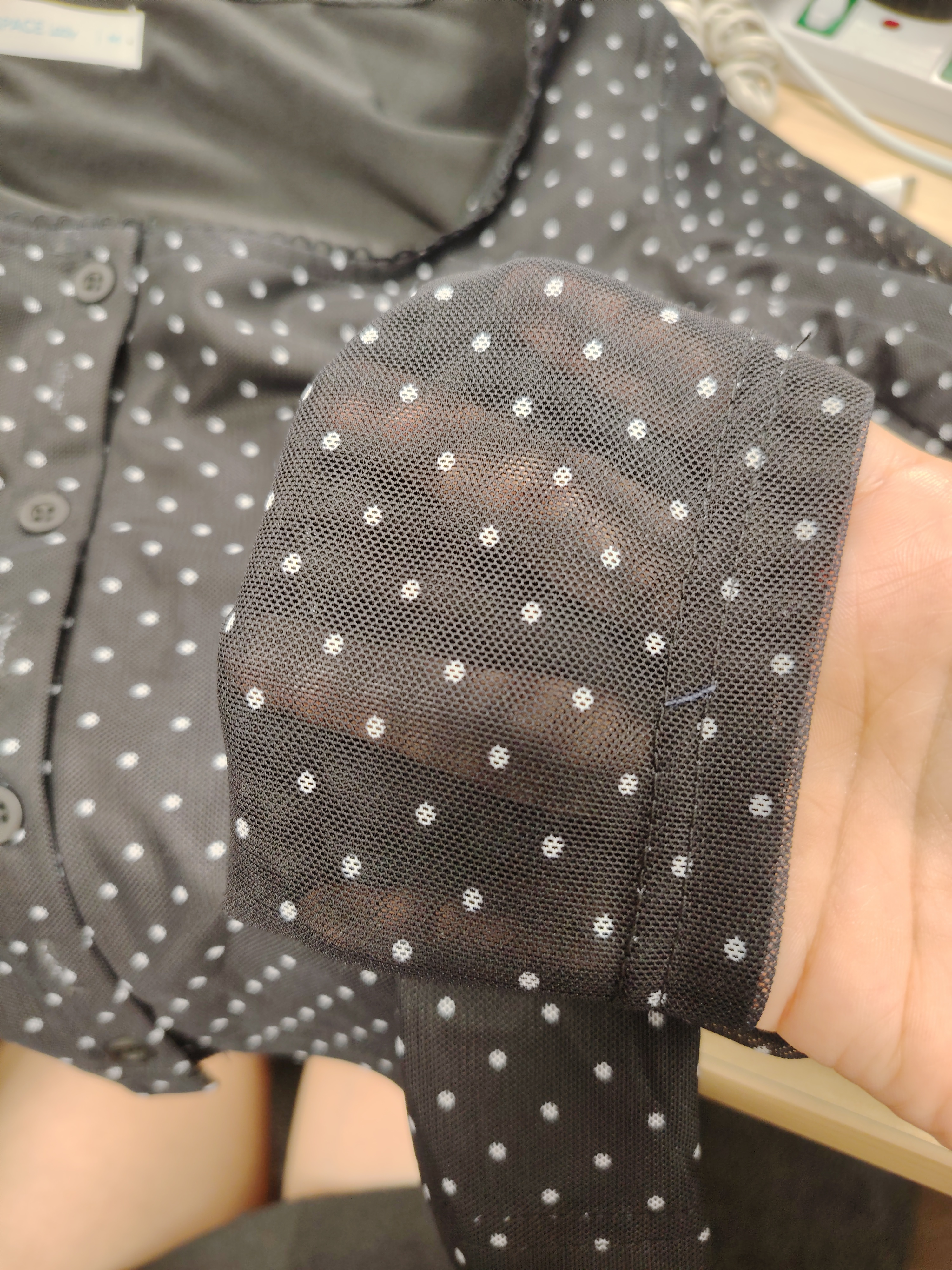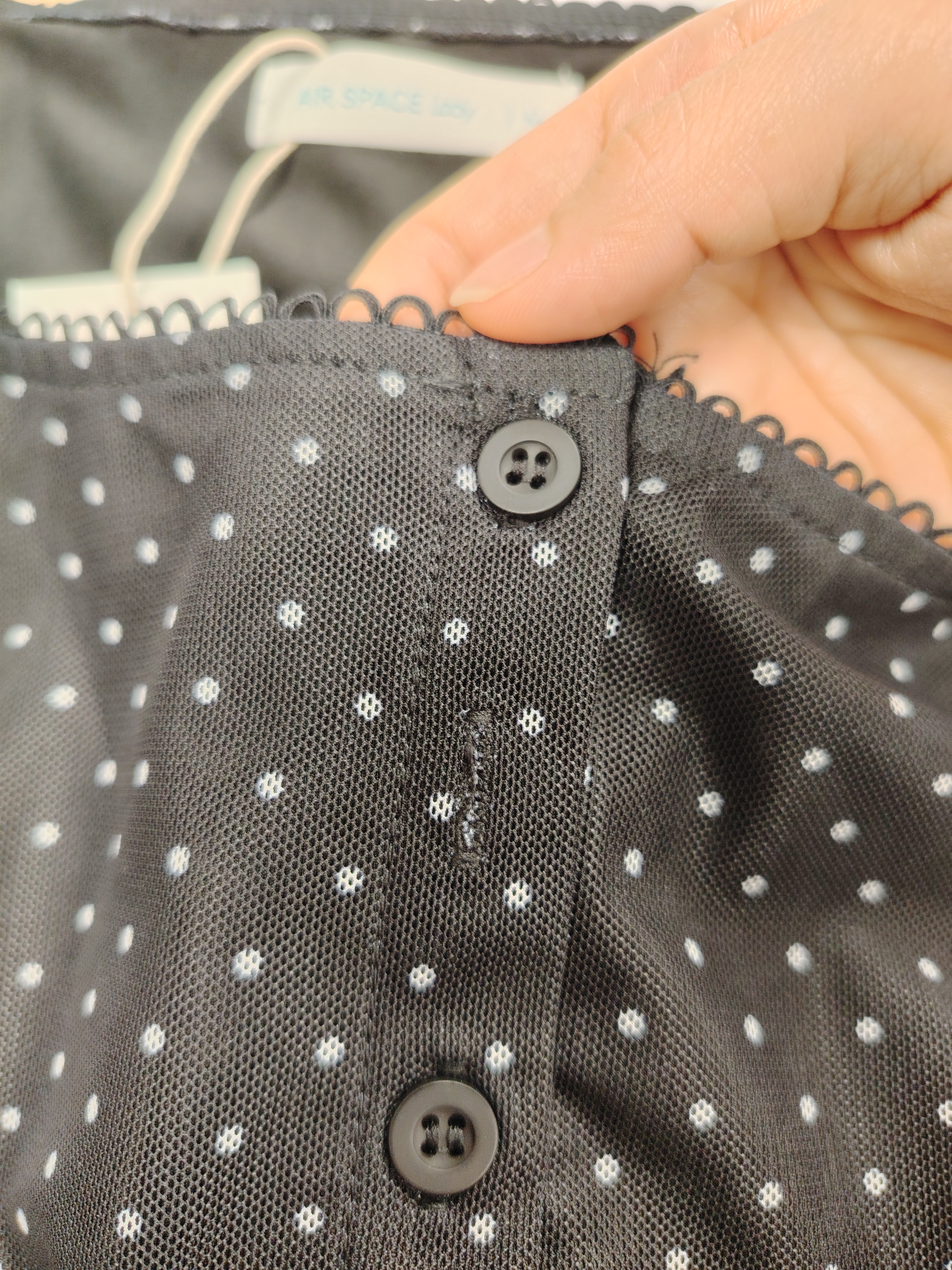 方領小花邊排扣開襟長袖短版點點網布上衣
