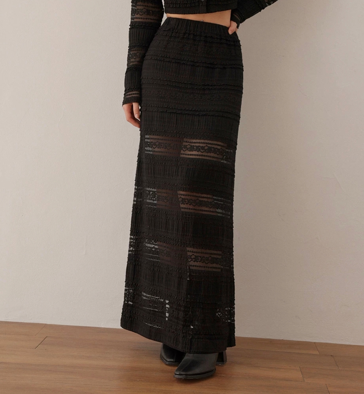 後開衩多層次花邊透膚蕾絲鬆緊直筒長裙