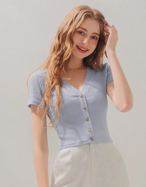 V領排扣短袖羅紋開襟衫