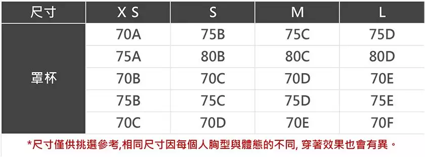 身形尺寸對照表