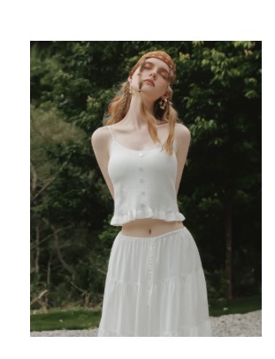 花扣蕾絲荷葉邊細肩帶針織背心(附胸墊)