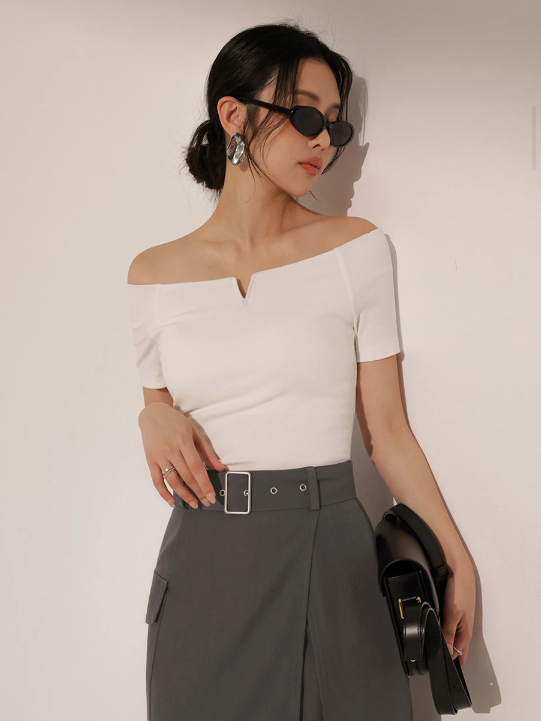 小V切口一字領短袖TEE( 附胸墊)
