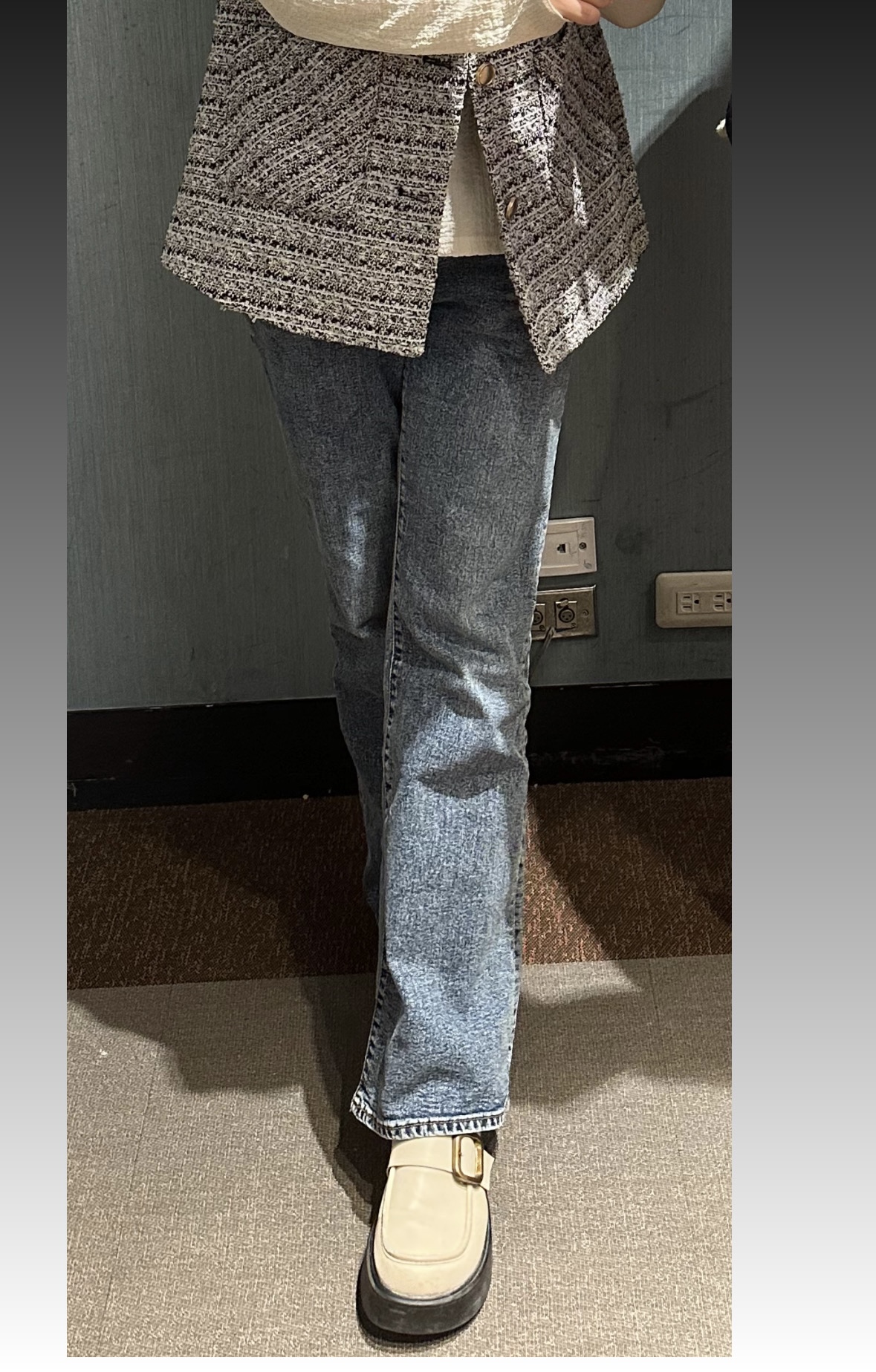 復古刷色高腰雙扣小喇叭牛仔褲