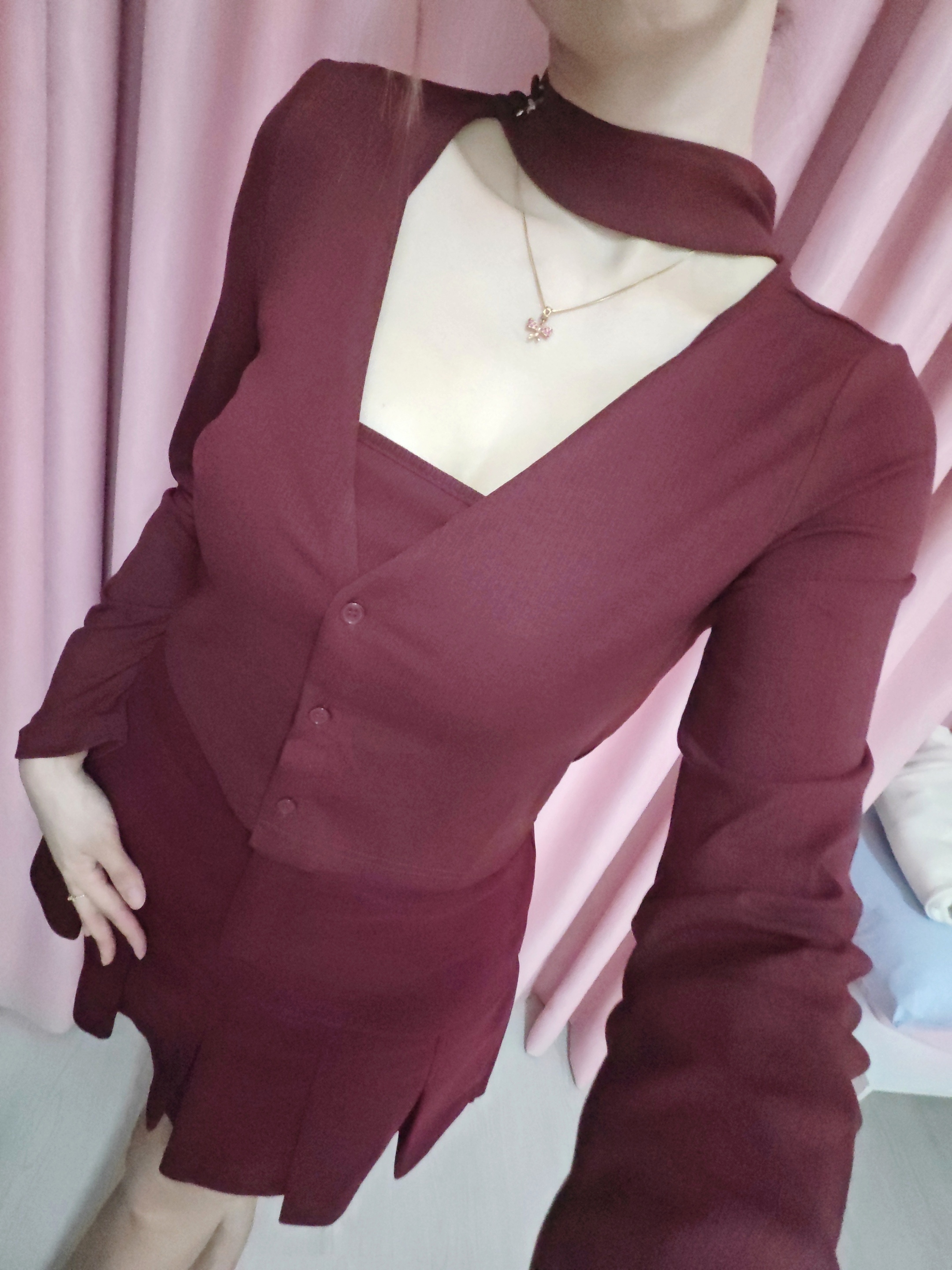 This maroon cardigan colour was a bit darker than usual maroon. It's pretty nice and perfectly match with it's same colour of maroon tube. Not thick, suit msia weather.