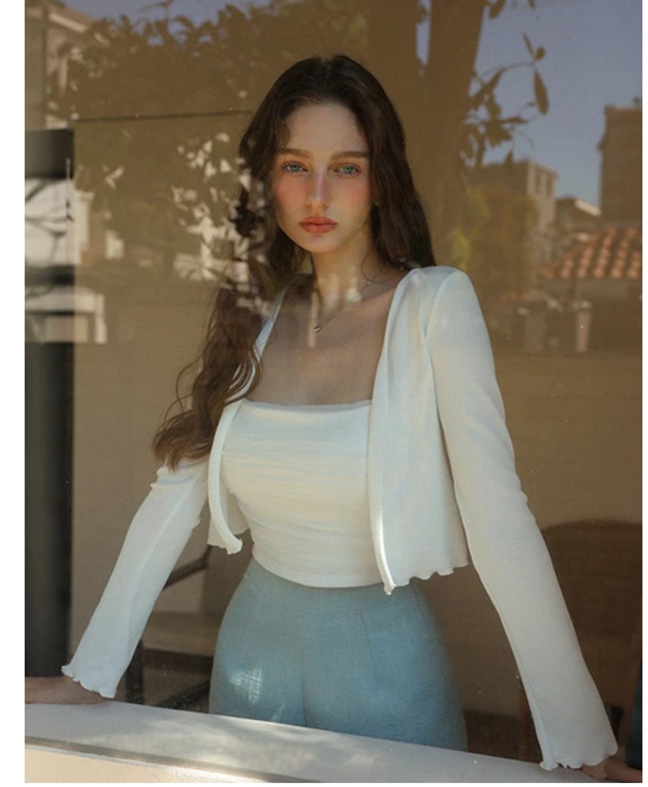 木耳邊長袖罩衫透紗細肩帶背心套裝(附胸墊)