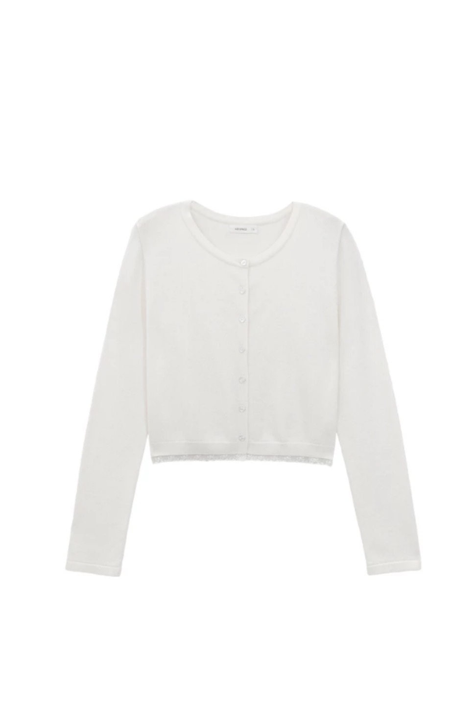 這款針織開襟衫,以精緻細節揉合了甜美與復古氣息。可愛的愛心排扣加上拼接蕾絲花邊的下擺設計,營造出甜美迷人的層次感。是一款想要擁有與眾不同的日常甜感的必入手單品。