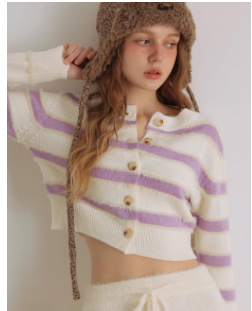 採用仿貂毛紗線交織出帶有層次的撞色橫條紋,不僅提升了精緻度,手感也更加溫暖豐富。短版剪裁配合經典的圓領排扣設計,無論將扣子全扣當作上衣,或敞開作為外搭,都能在視覺上大幅延伸腿部線條,展現出充滿青春活力的樣貌。