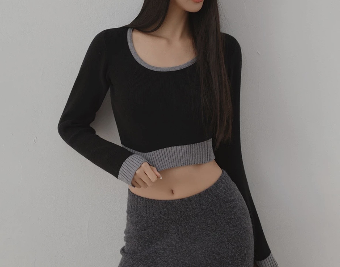 圓領撞色滾邊長袖短版合身針織衫