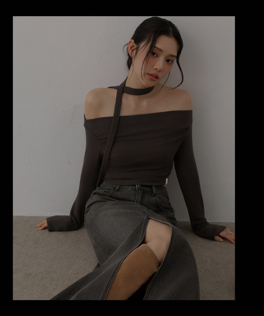 一字領抓皺設計內磨毛長袖短版上衣(附領巾)