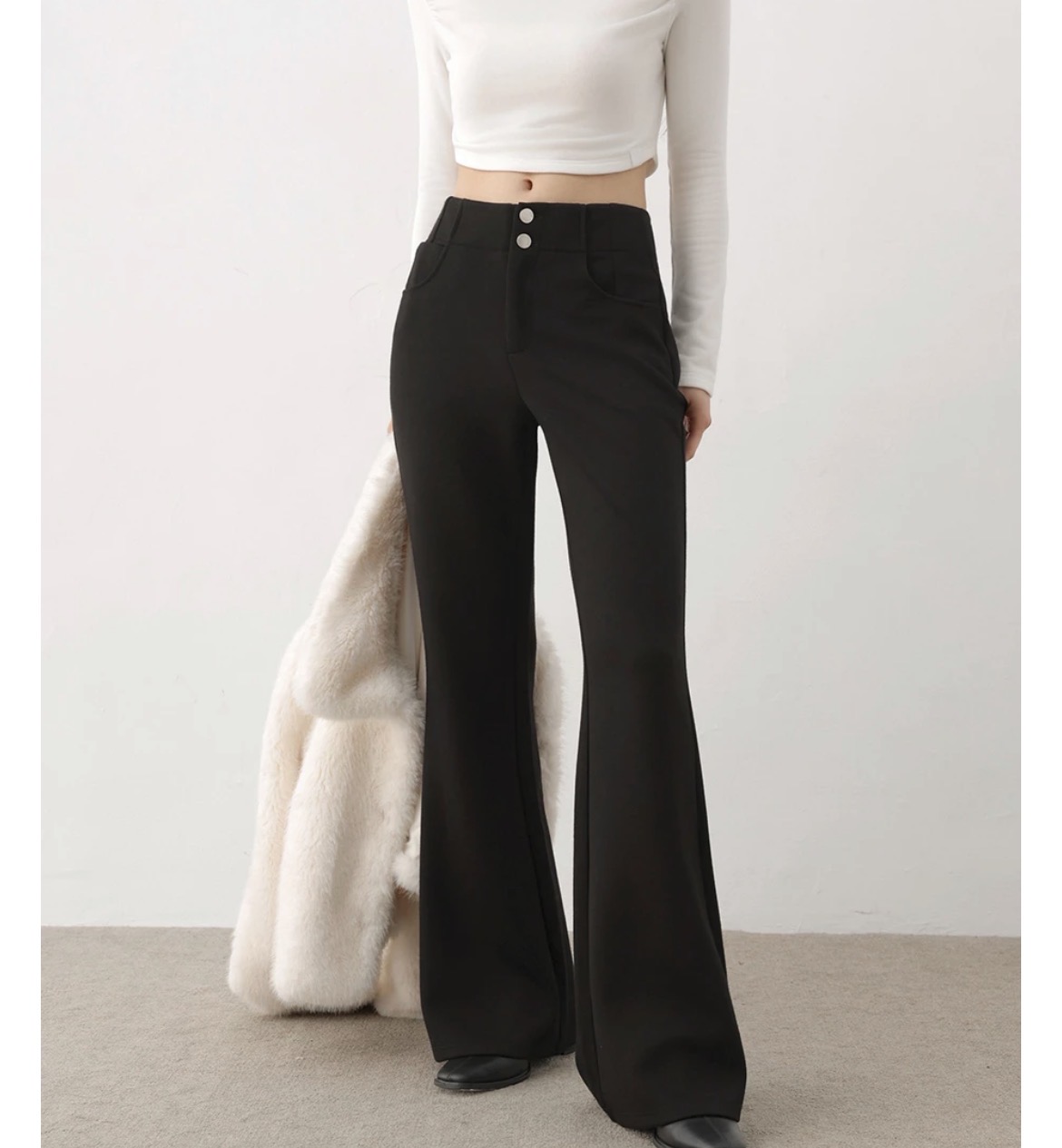 空氣層面料的特色為親膚、Q彈、透氣,立體結構織法不易皺,具有絕佳舒適穿著感。雙扣設計拉長比例,喇叭褲型修飾雙腿不顯胯,營造纖腰長腿效果。