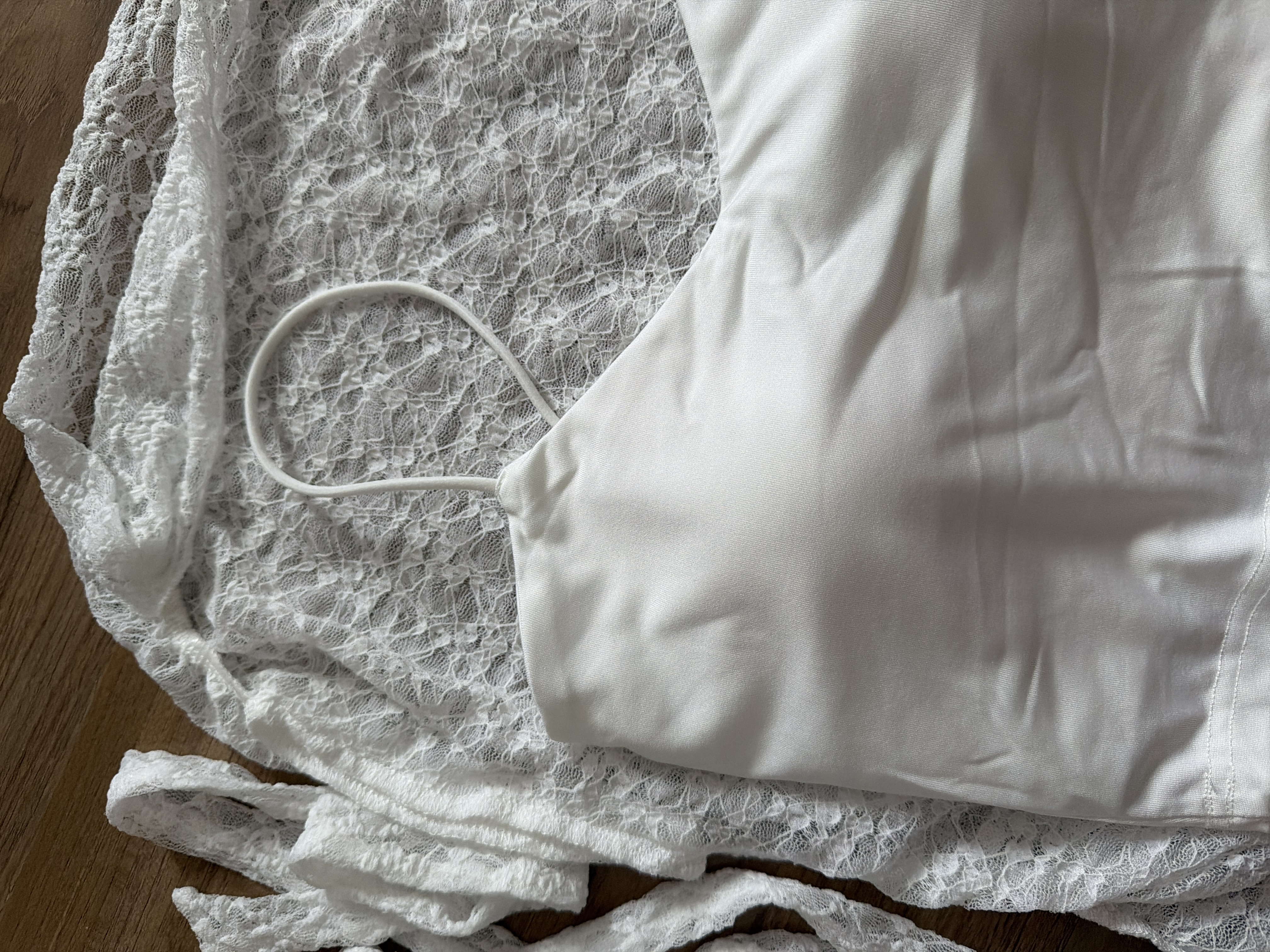 非常粉嫩又仙女的一件,但尺寸偏小,可能仙女都不能吃飯吧🥹蕾絲部分不刺膚,材質還可以