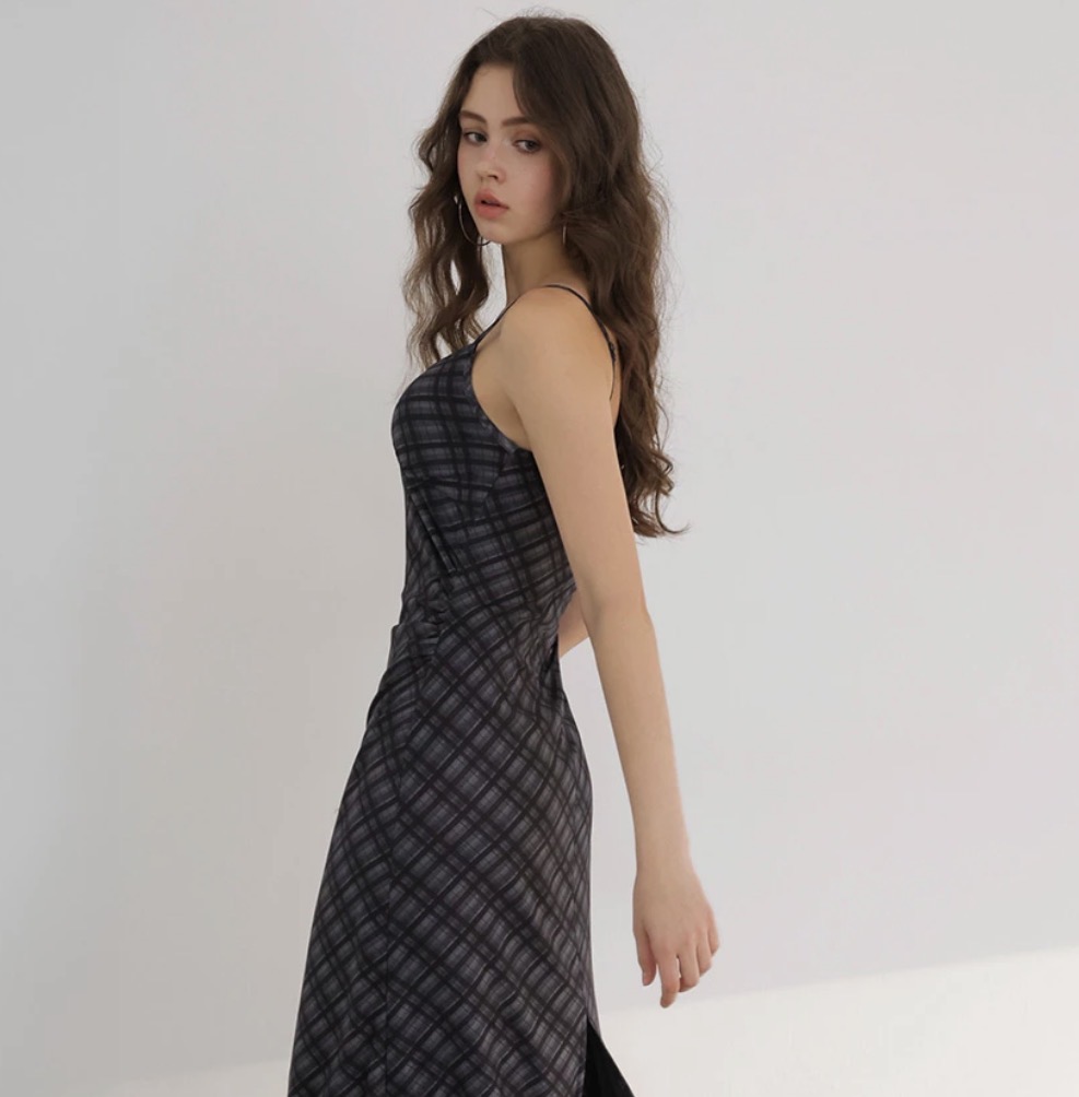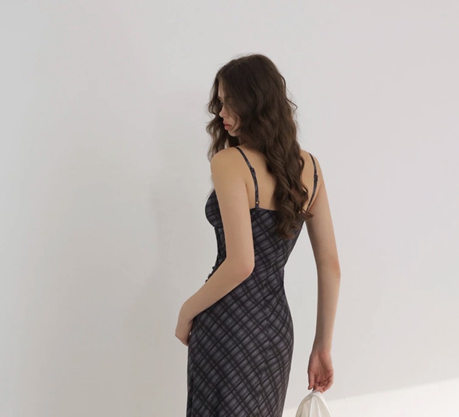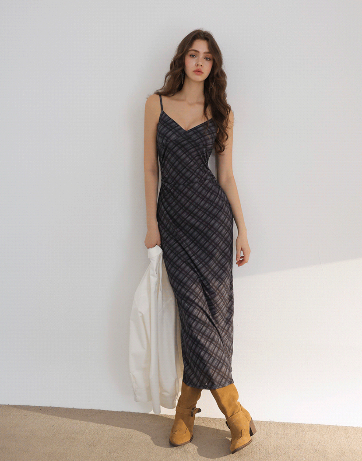 V領細肩帶後開衩格紋合身長洋裝(附胸墊)