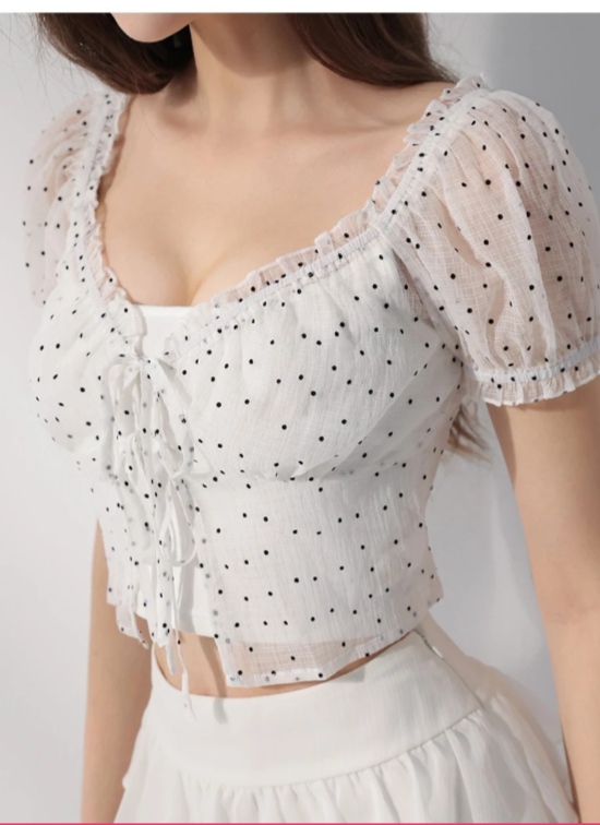 V領荷葉綁帶澎袖點點透膚短版上衣細肩帶背心套裝
