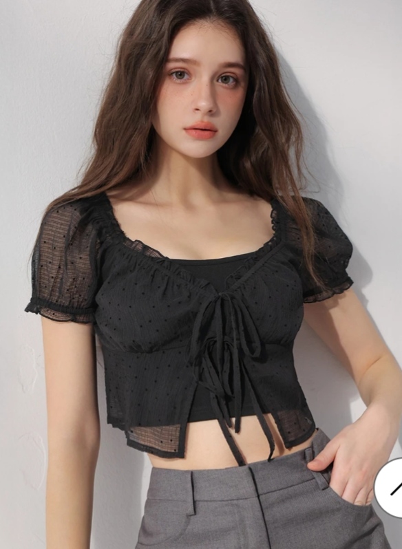 外罩上衣使用輕盈的點點透膚布料加上荷葉邊,營造出層次分明的輕甜氛圍,同時修飾頸部線條。公主澎袖與短版剪裁相互映襯,優化身形比例。內搭同色系細肩帶背心,讓疊搭更顯一致。不論搭配褲裝或裙裝,都能展現浪漫甜美的氣場。