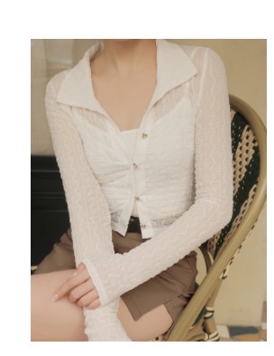 【HEYMAN聯名】翻領愛心扣開襟波紋皺褶透紗長袖短版上衣細肩帶背心套裝