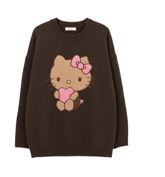 這款長版毛衣以細緻緹花工藝呈現擁抱愛心的烤焦版Kitty 圖案,非常可愛。寬鬆長版型包容各種身形,無論是甜美的百褶裙還是率性的皮短褲,都能完美搭配,展現出溫暖且充滿活力的層次穿搭。