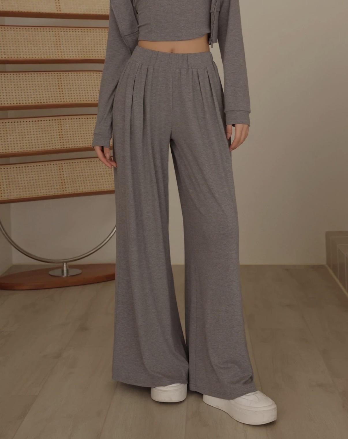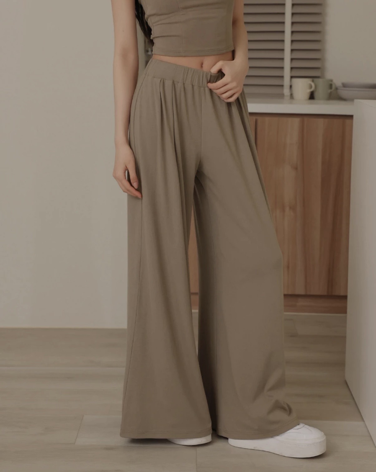 中低鬆緊腰打褶設計莫代爾休閒寬褲
