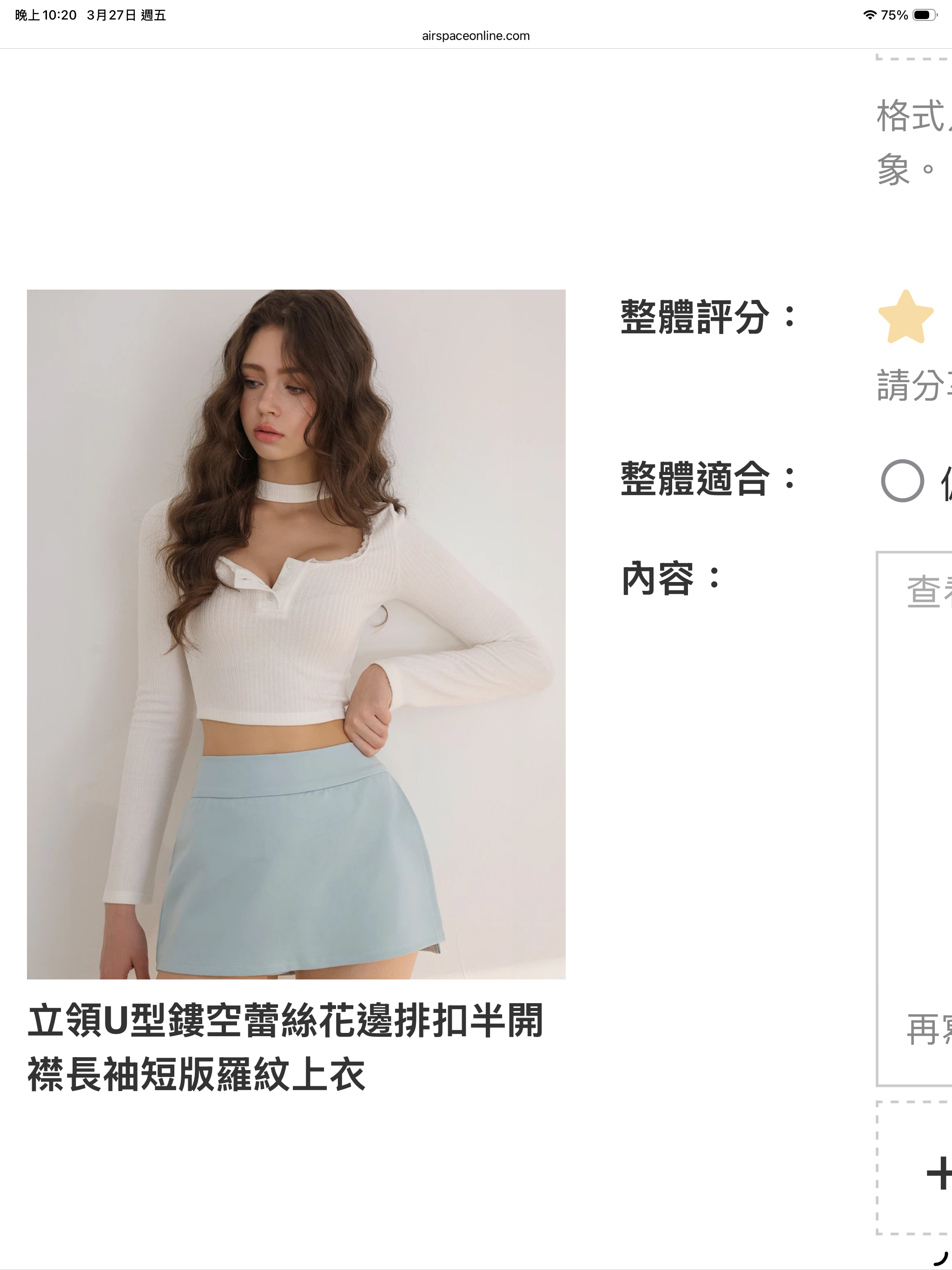 非常好看的造型衣服也很貼身,但是真的很可惜沒有胸墊 這種衣服如果有胸墊的話 會更好看因為內衣穿上去真的不好看