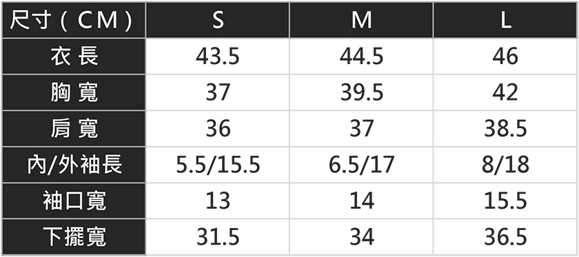 | 版型 | 貼身 | 1 | 2 | 3 | 4 | 5 | 寬鬆 |