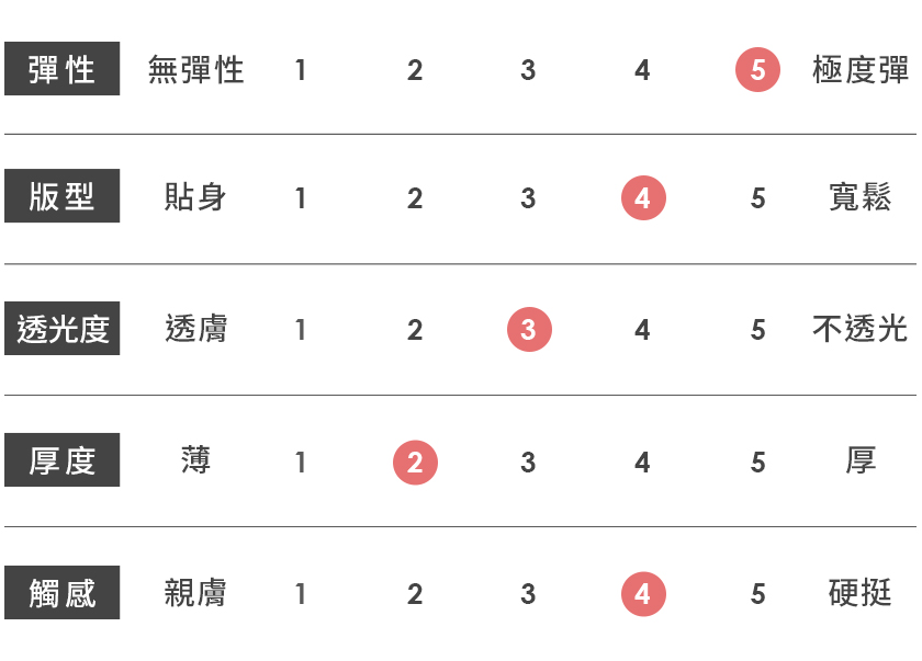 | 彈性 | 無彈性 | 1 | 2 | 3 | 4 | 5 | 極度彈 |