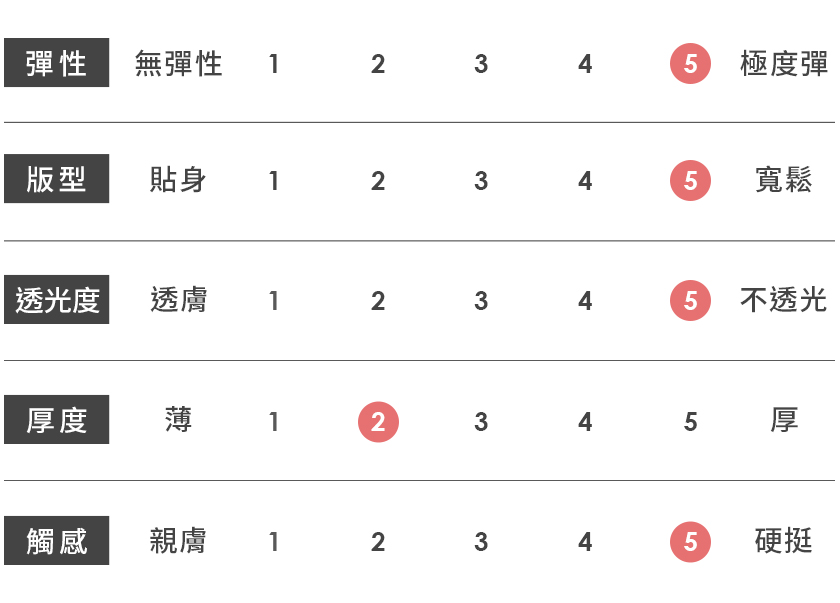 觸感 | 親膚 | 1 | 2 | 3 | 4 | 5 | 硬挺 |
