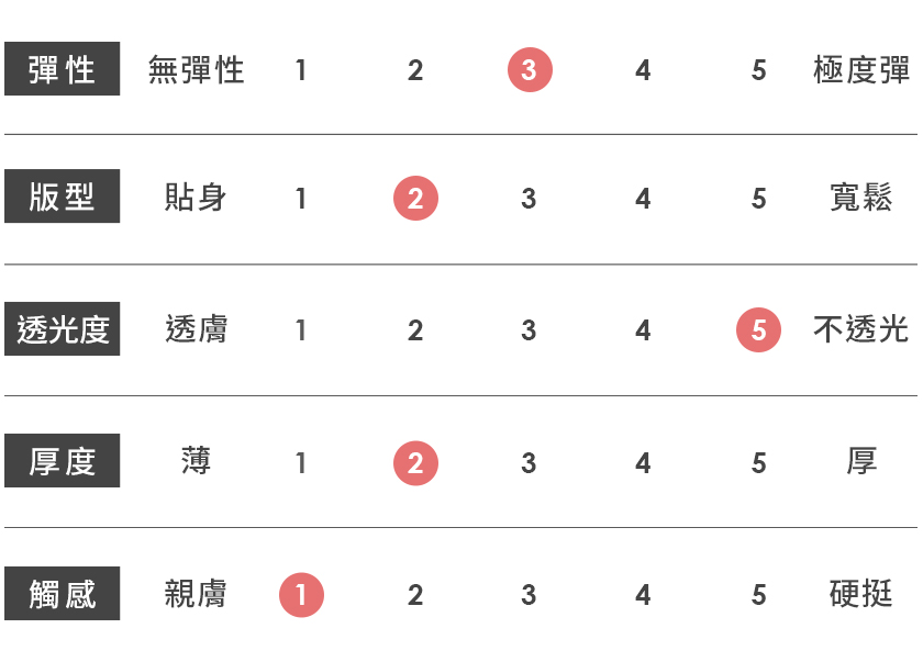 | 觸感 | 親膚 | 1 | 2 | 3 | 4 | 5 | 硬挺 |
