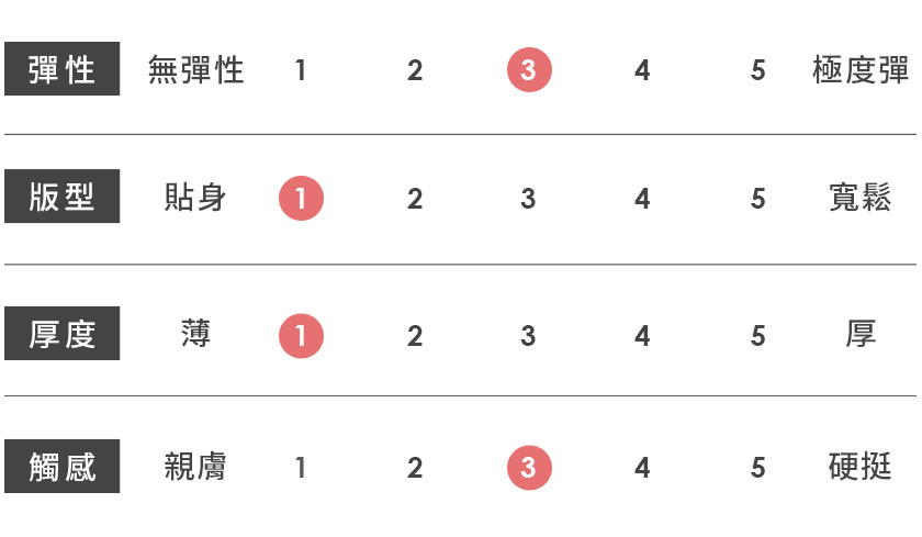 | 觸感 | 親膚 | 1 | 2 | 3 | 4 | 5 | 硬挺 |