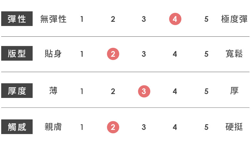 | 觸感 | 親膚 | 1 | 2 | 3 | 4 | 5 | 硬挺 |