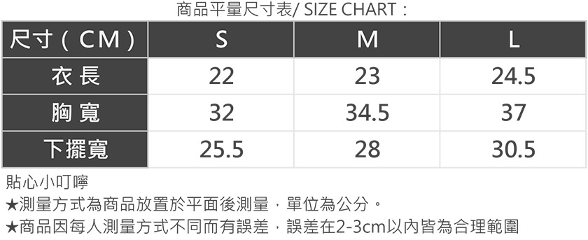 不確定自己的尺寸嗎?別擔心,我們幫你搞定。你可以參考下方商品評量尺寸表或是身材測量方式找到最適合你的尺碼,如果還有疑問也歡迎隨時聯繫我們的客服團隊。