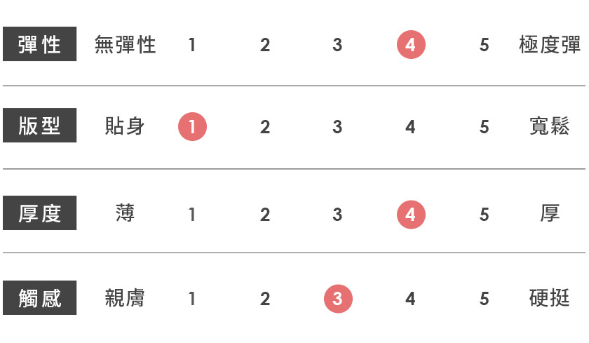 | 觸感 | 親膚 | 1 | 2 | 3 | 4 | 5 | 硬挺 |